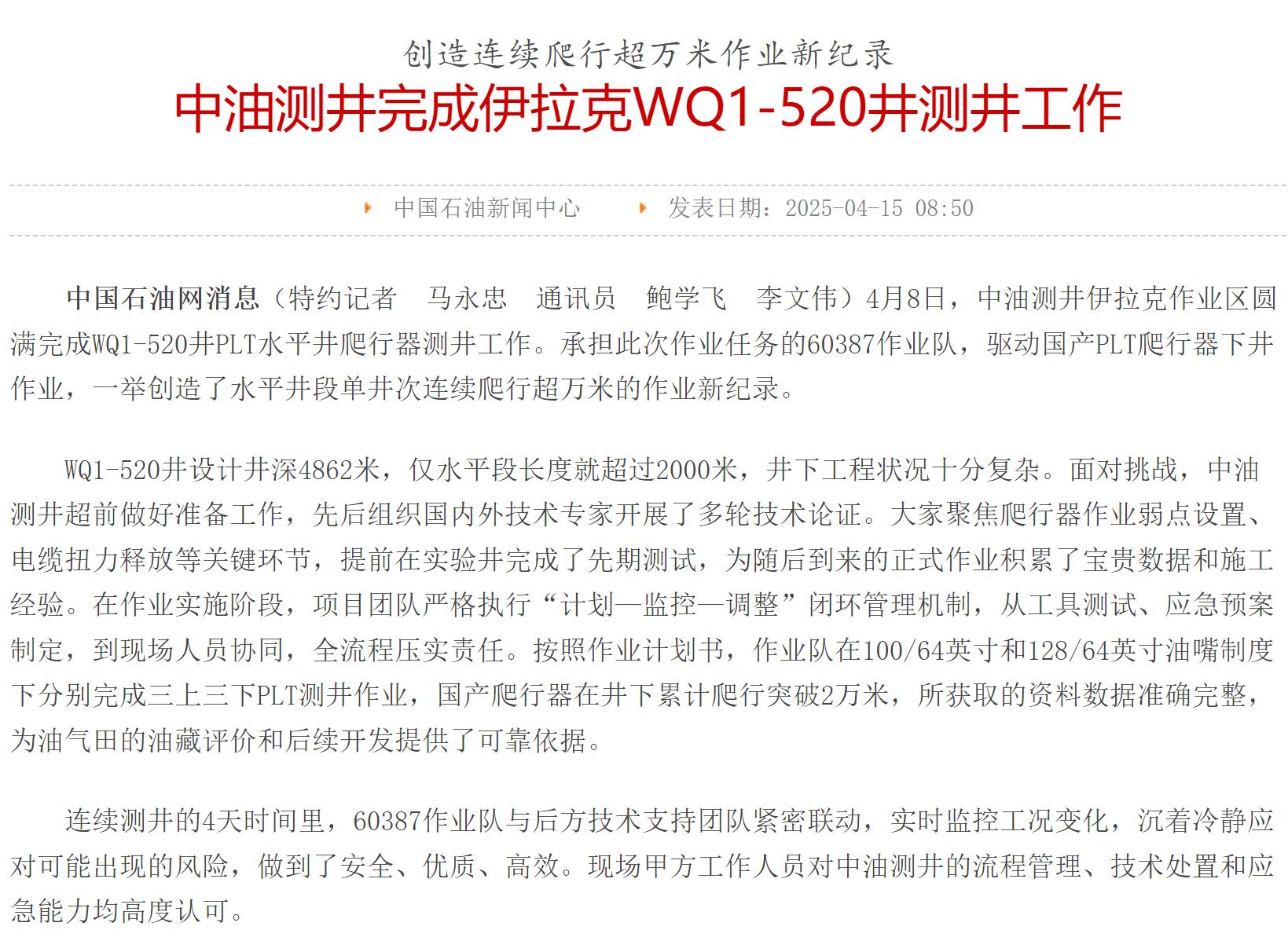 該設(shè)備于2025年4月8日在中石油國(guó)際公司嚴(yán)格高效施工管理下,圓滿完成WQ1-520井的萬米PLT水平井爬行器測(cè)井作業(yè),一舉創(chuàng)造了水平井段連續(xù)爬行超萬米累計(jì)爬行突破2萬米零故障的作業(yè)新紀(jì)錄!